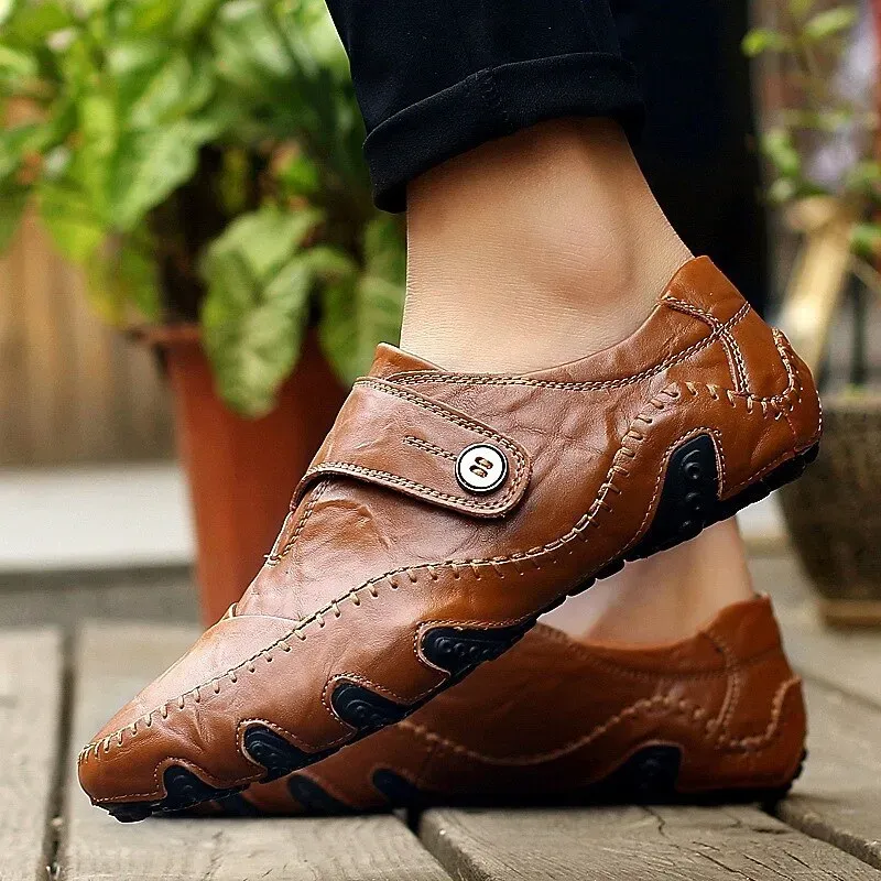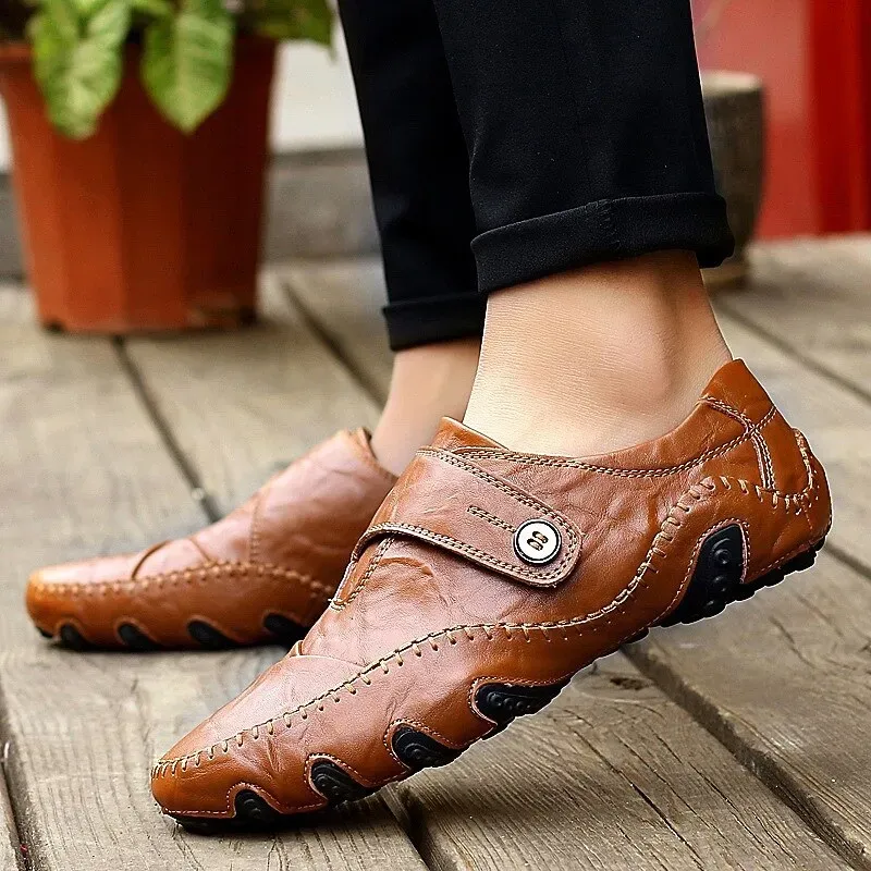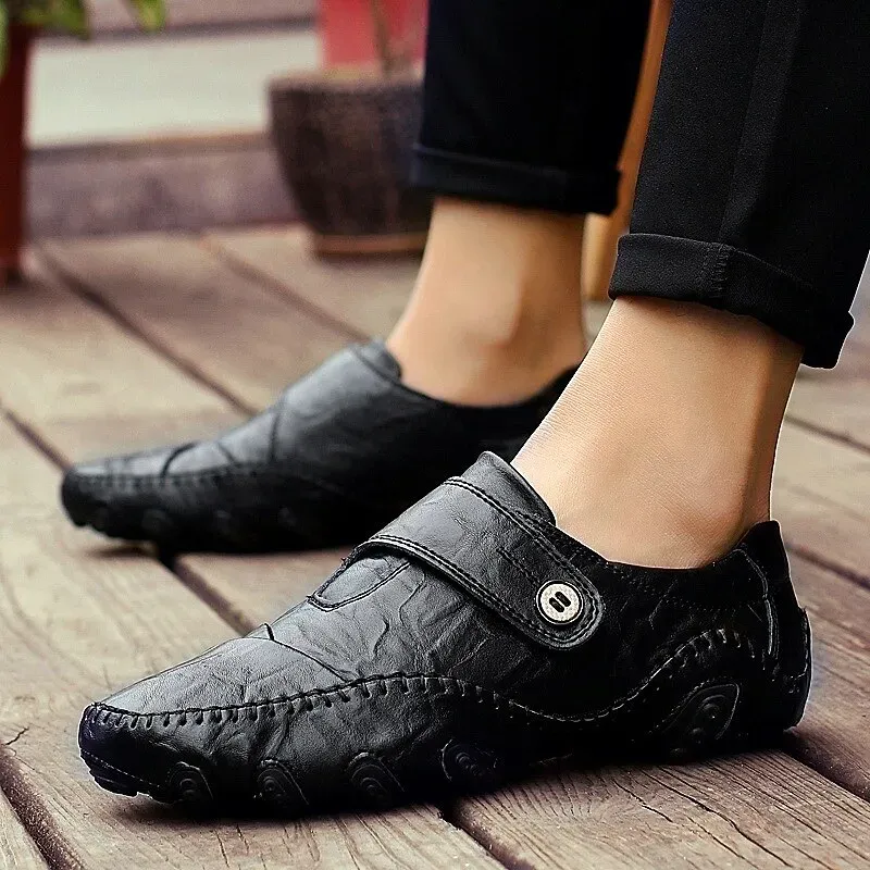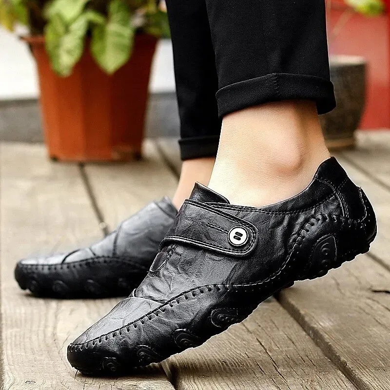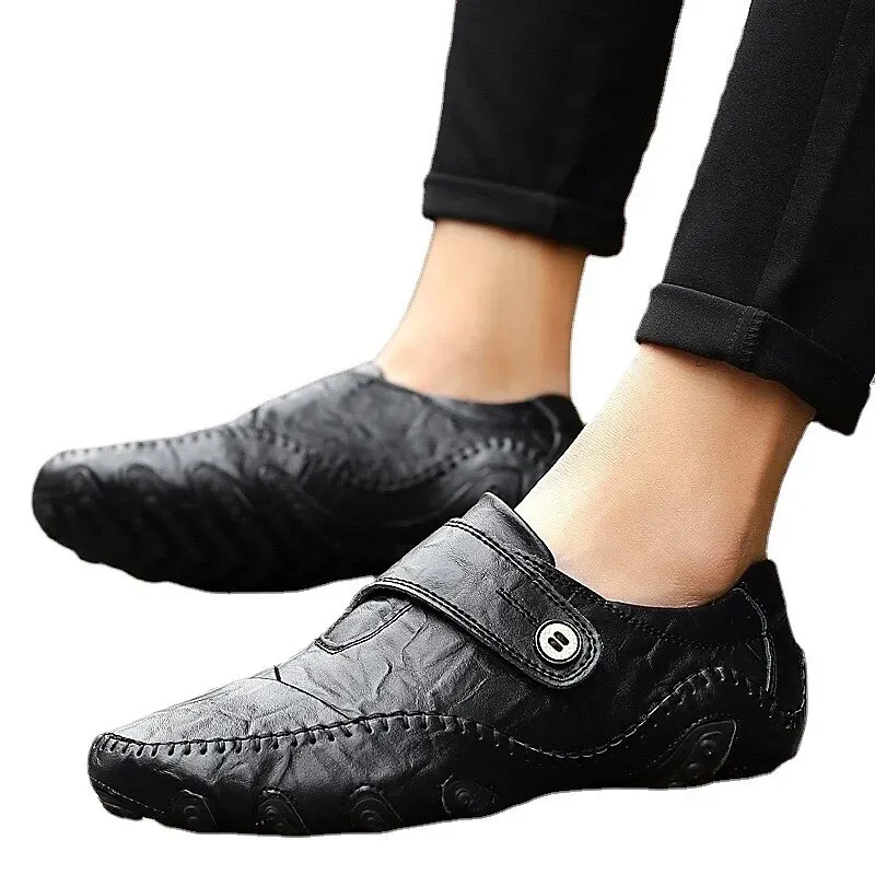 - [Design Features]: These men’s loafers incorporate meticulous splicing and detailed stitching that enhance durability and showcase sophisticated craftsmanship. The unique button detail on the side not only adds aesthetic value but also ensures a secure fit. The Magic Tape closure offers convenience and a personalized fit.
