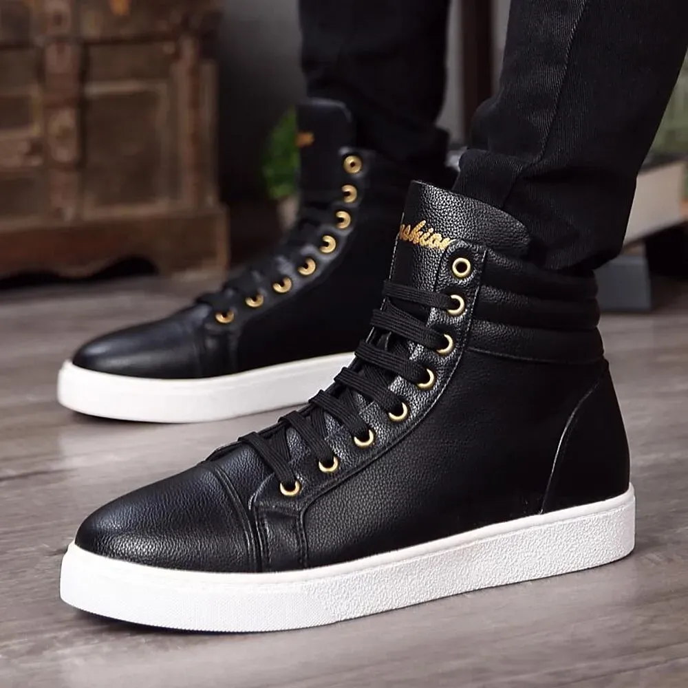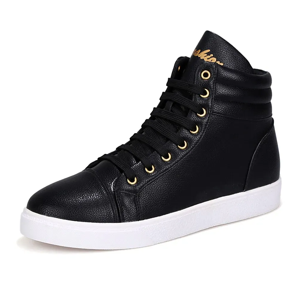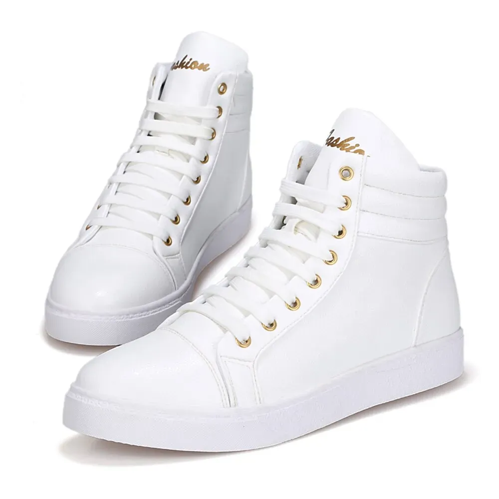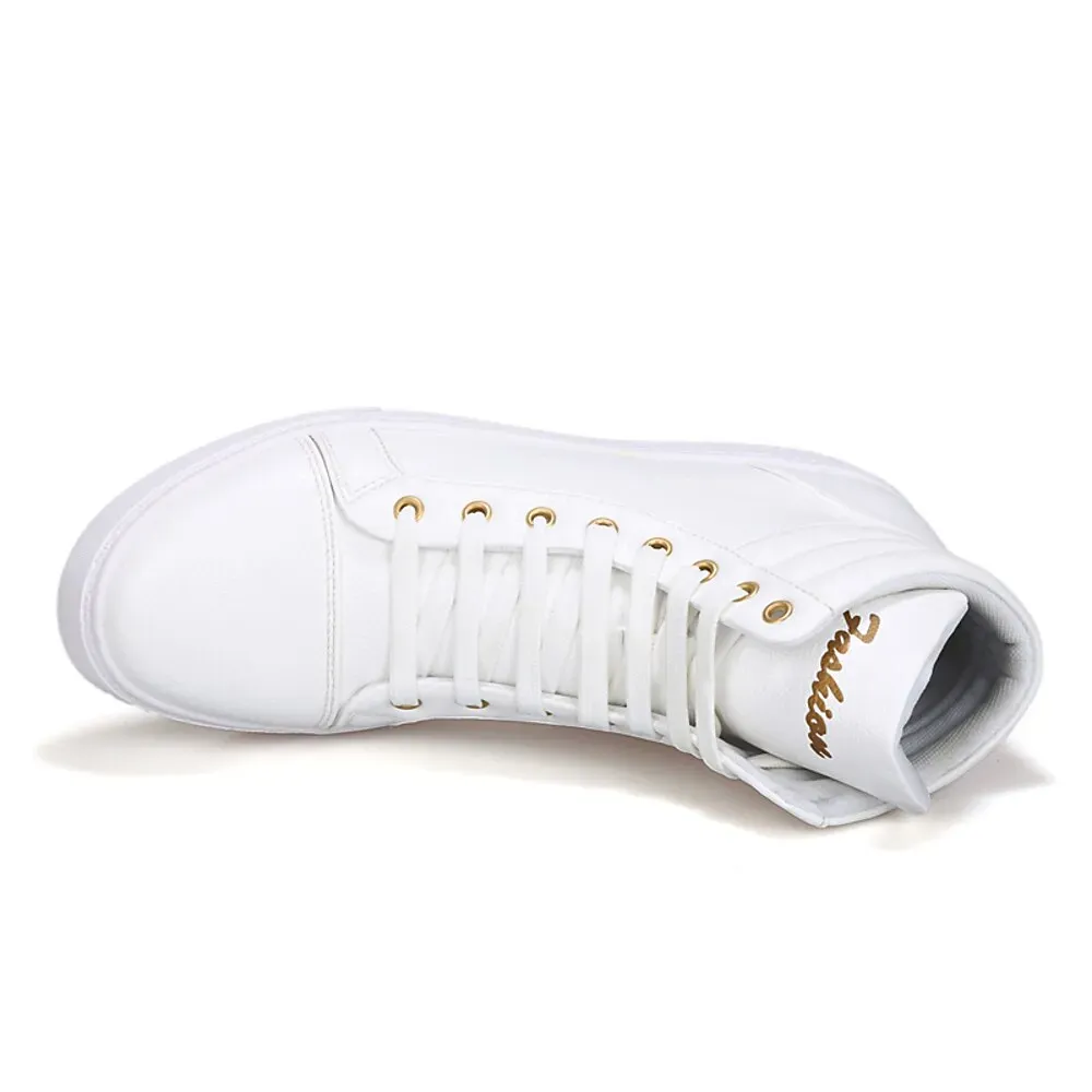 [Fabric]: Crafted from premium faux leather, these men’s high-top sneakers showcase a smooth and polished finish, ensuring durability and a stylish appearance for everyday wear.[Fit]: Featuring a classic high-top design, these sneakers offer excellent support around the ankle, making them a perfect choice for both style and functionality. The padded collar enhances comfort, while the rubber outsole provides reliable traction.[Design Highlights]: The sneakers are distinguished by their gold-accented eyelets, adding a touch of elegance to the all-white aesthetic. The classic lace-up closure allows for a personalized fit, while the round toe design keeps the sneakers looking timeless.[Occasions]: Ideal for daily use, these sneakers complement a range of outfits, suitable for casual outings, weekend gatherings, and urban adventures. Their modern design paired with traditional sneaker elements makes them versatile for various settings.[Size Range]: Available in a variety of sizes to accommodate different preferences, from size 39 to 44. These sneakers are designed to fit comfortably and stylishly, perfect for those who appreciate a contemporary yet classic footwear option.